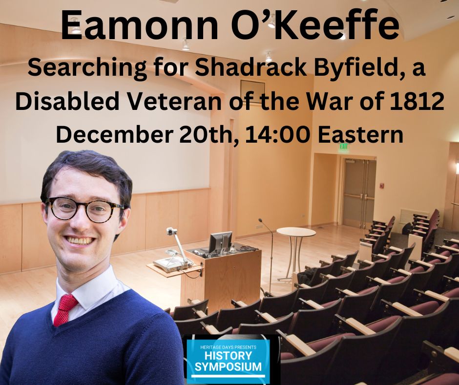 « All Events Eamonn O’Keeffe – Searching for Shadrach Byfield, a Disabled Veteran of the War of 1812 December 20 @ 2:00 pm – 3:00 pm More InformationO’Keeffe Registration Add to calendar Google Calendar iCalendar Outlook 365 Outlook Live